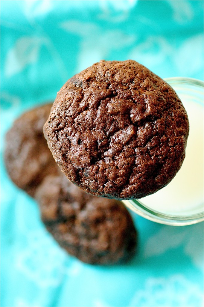 Since this was an impromptu recipe for me, I didn’t have all the ingredients on hand.  I had to modify the recipe quite a bit-I had to leave out quite a bit of chocolate (travesty), but the cookies still had enough chocolate to knock out my intense chocolate cravings.  And, better yet, they are Elliott and Oliver-approved.  Moist, thick, and fantastic with a cold glass of milk and a movie date with your nephews. Life doesn’t get much better than that.