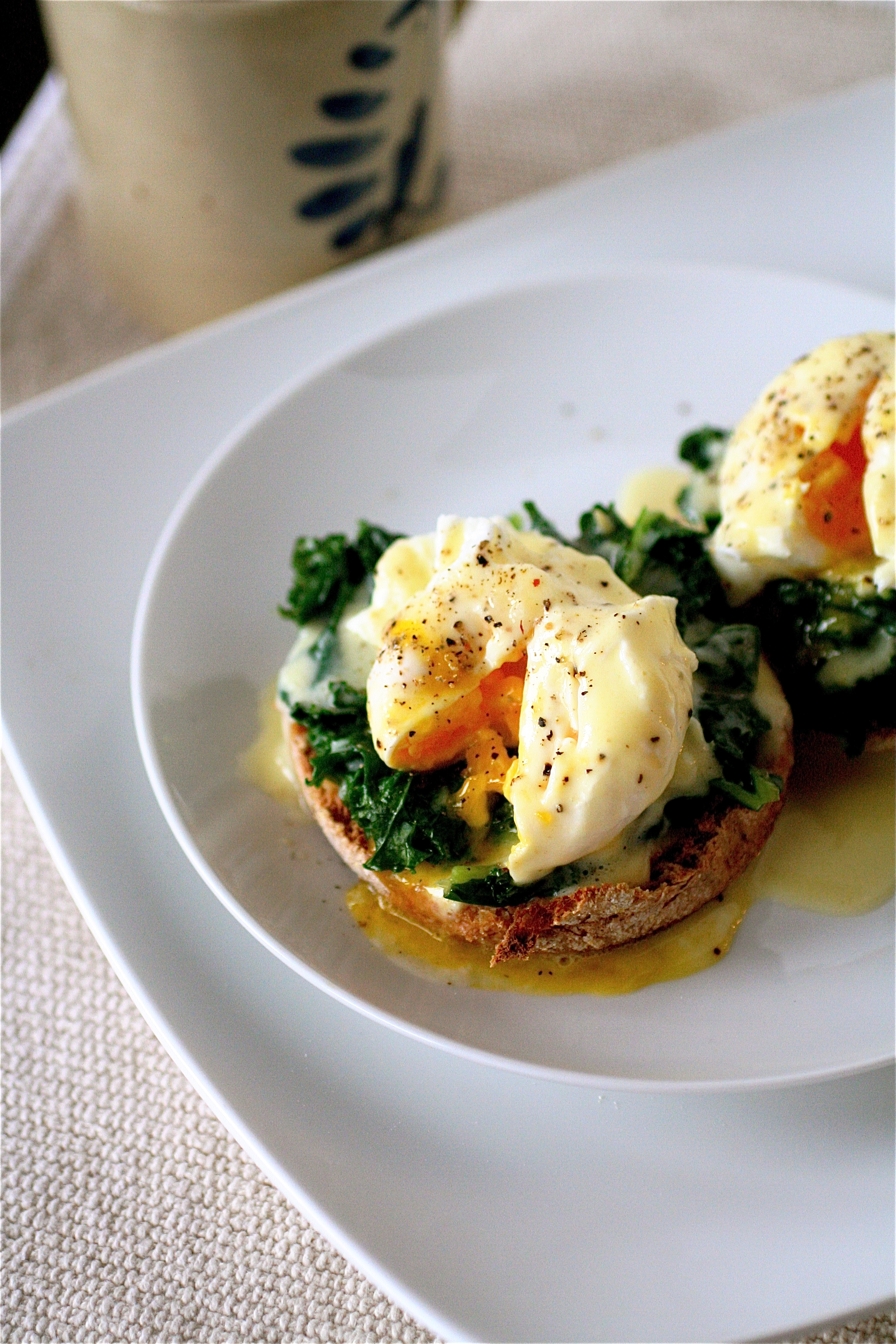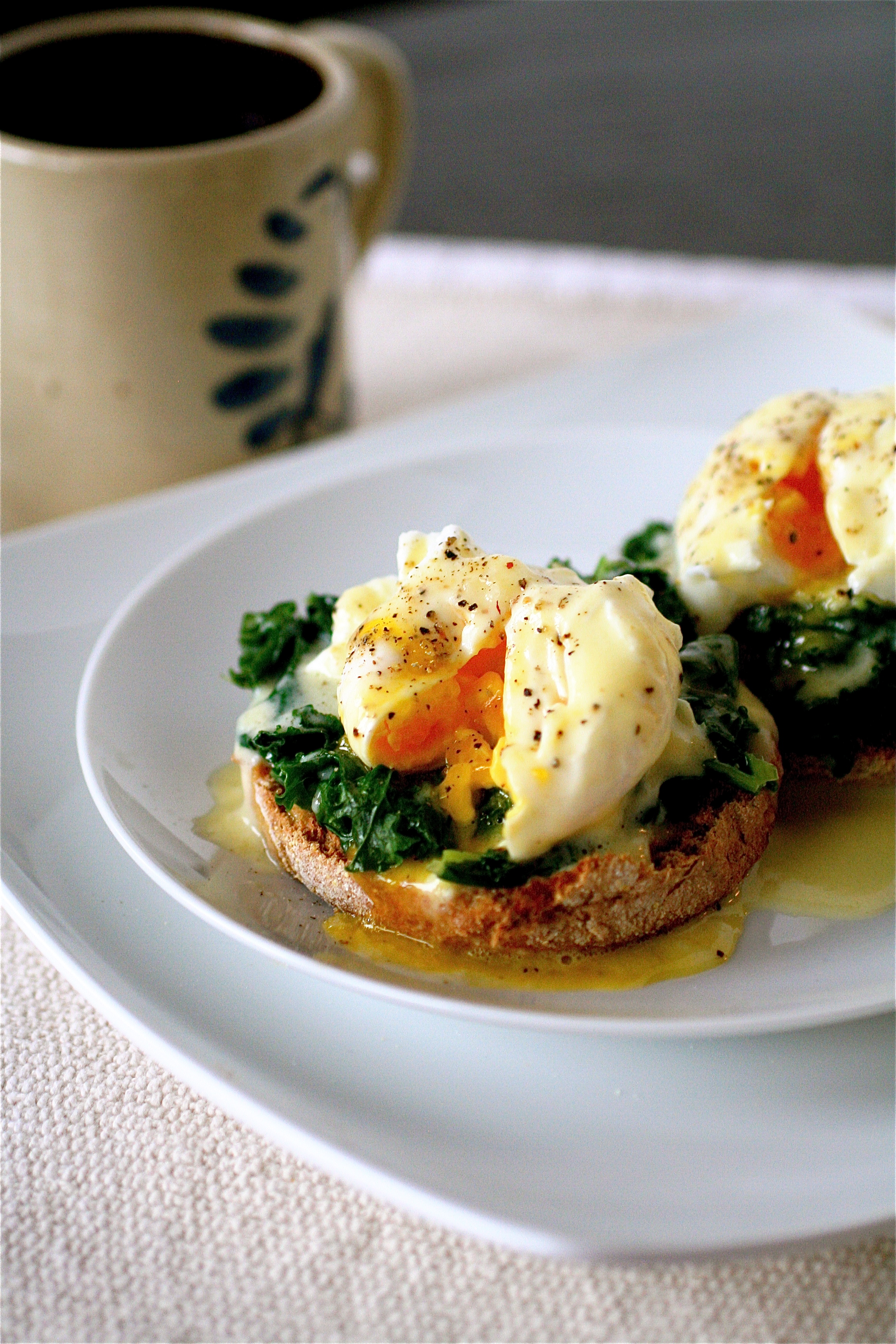 9. To assemble the dish:  Top each toasted English muffin with a few tablespoons of the cooked kale/garlic mixture, a poached egg, and a few tablespoons of the butter sauce.  Serve immediately.