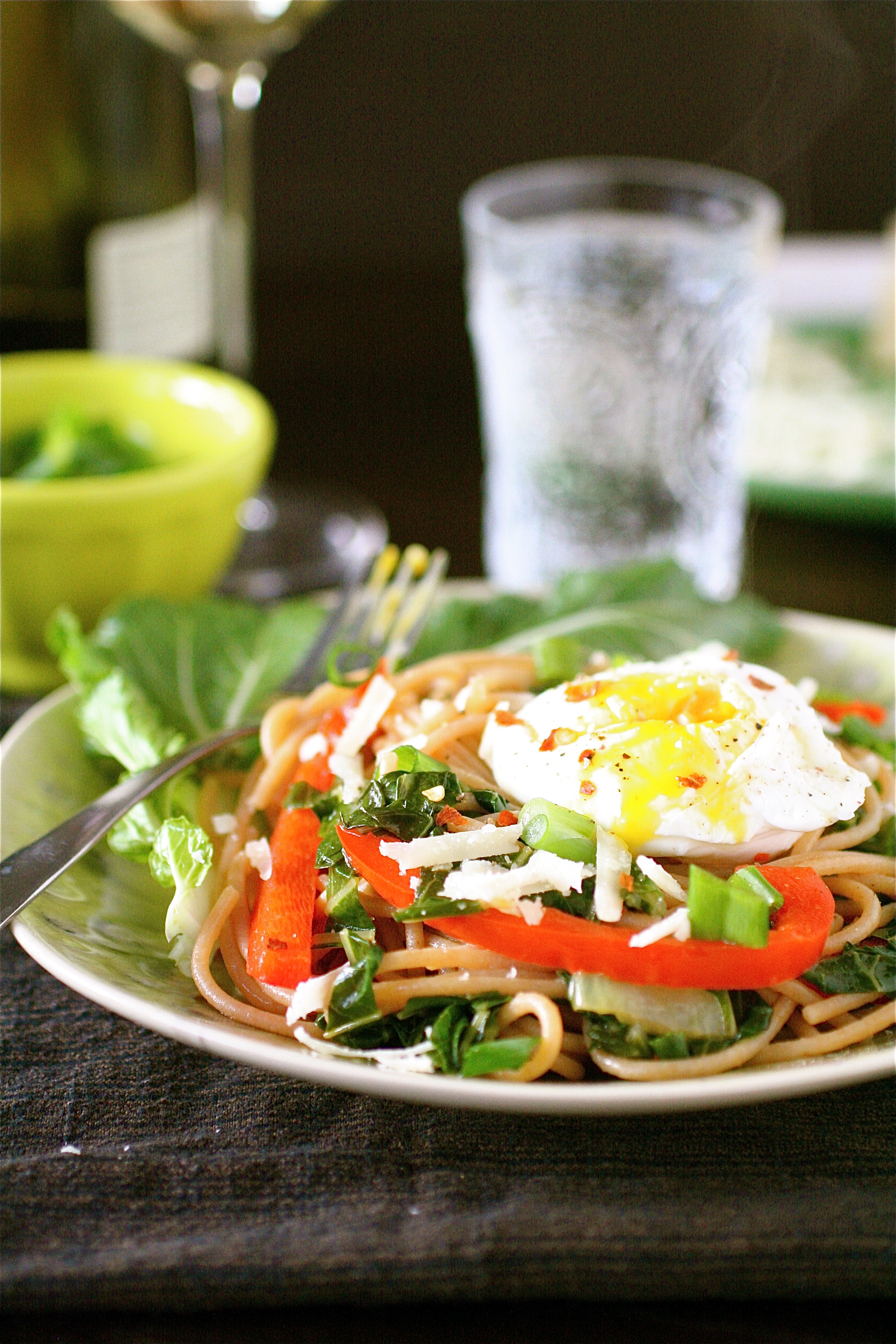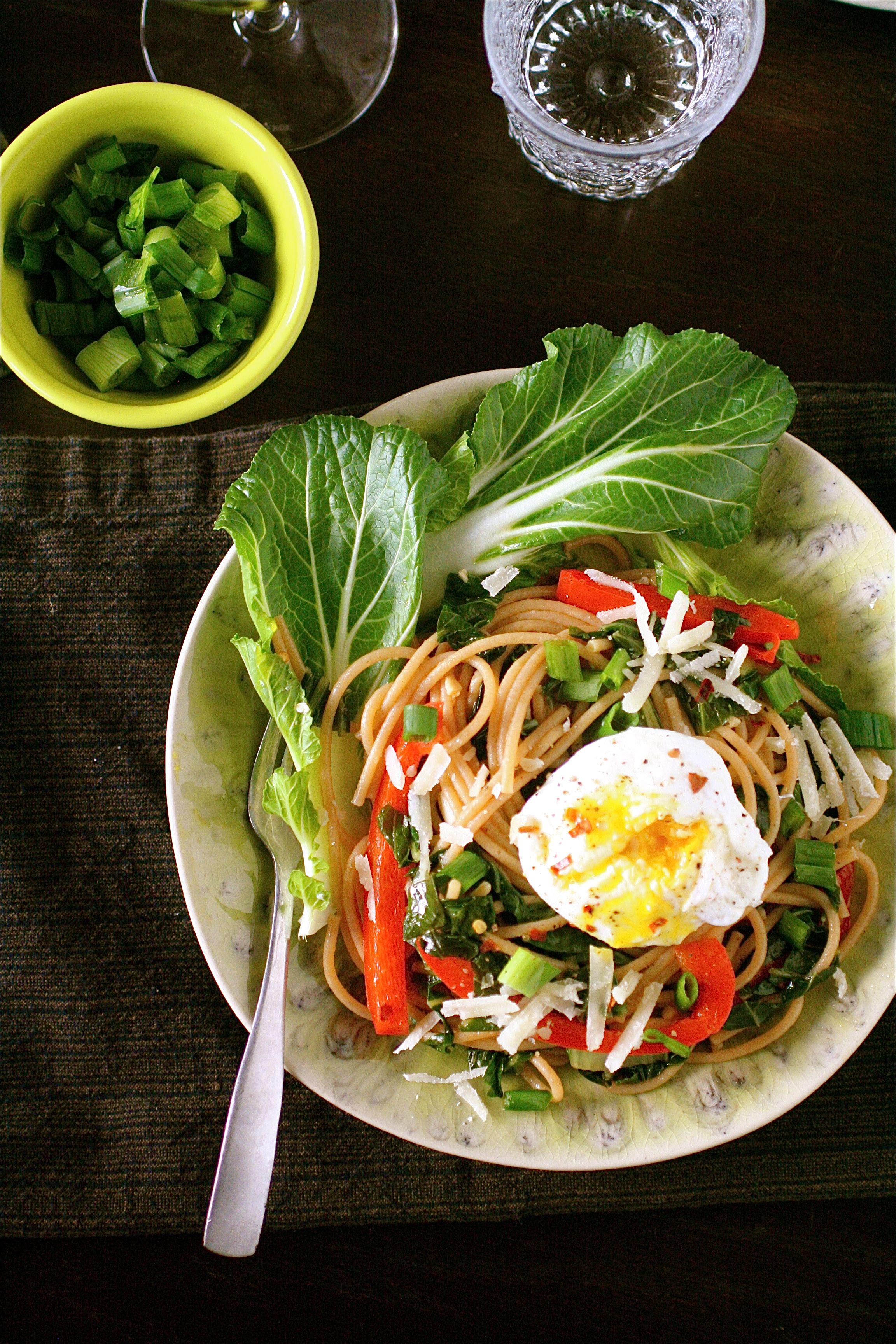 Spaghetti with Bok Choy and Poached Egg