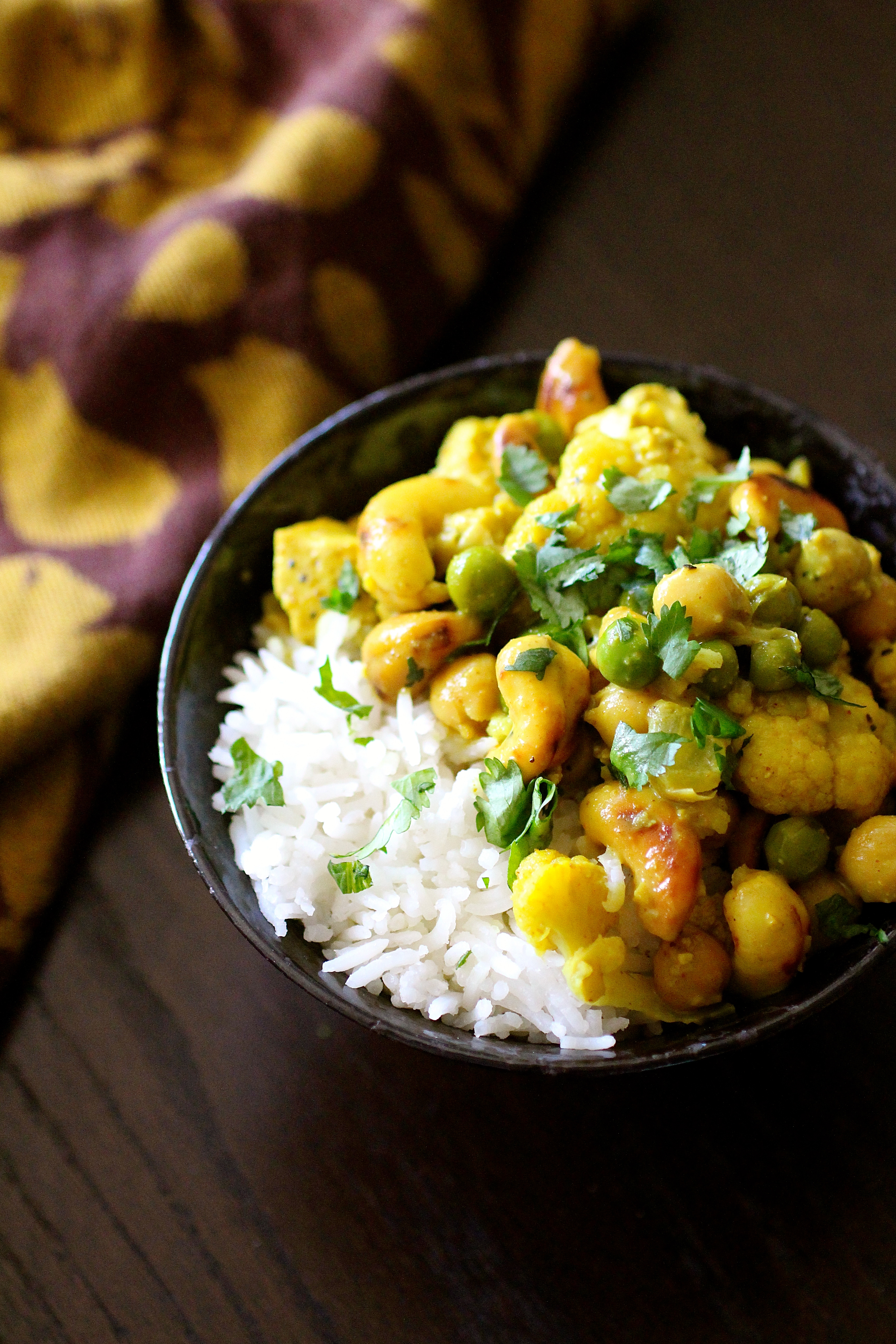 Regardless, a curry is a great way to sneak in some extra veggies and a little bit of protein…whatever your choice of protein may be. I used an extra-firm tofu here, which I recommend, but you could use whatever you like. The other thing about a curry? It’s completely amenable to whatever veggies you have on hand (or need to use up to free some space up in your freezer….seriously, I couldn’t get the freezer door to close the other day because I have stocked up on way too many things apparently.) This particular curry highlights the seasonal trend of the moment: cauliflower. And pretty much anything with cashews in it is awesome as well.