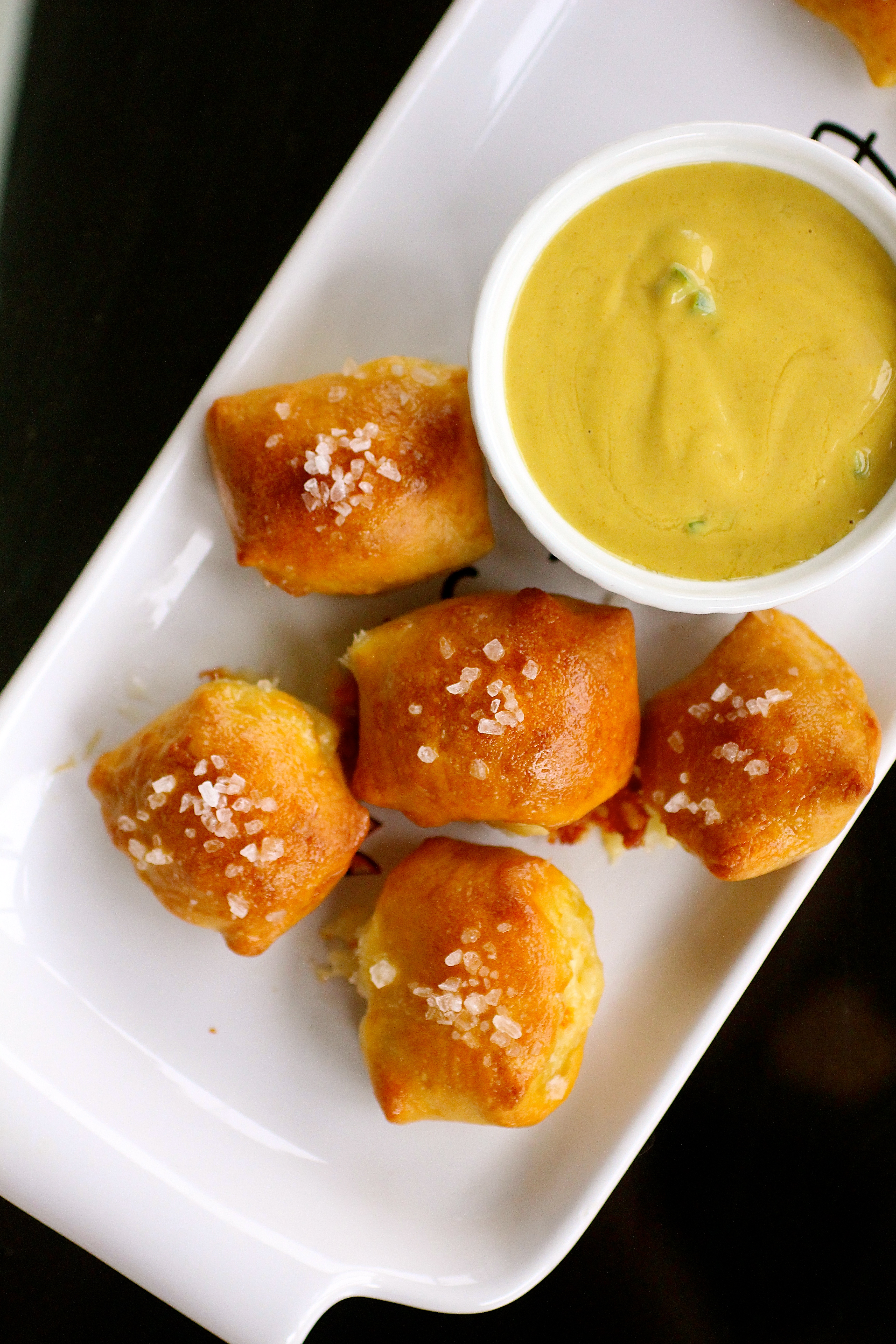 White Cheddar Filled Pretzel Bites with Honey Jalapeno Mustard