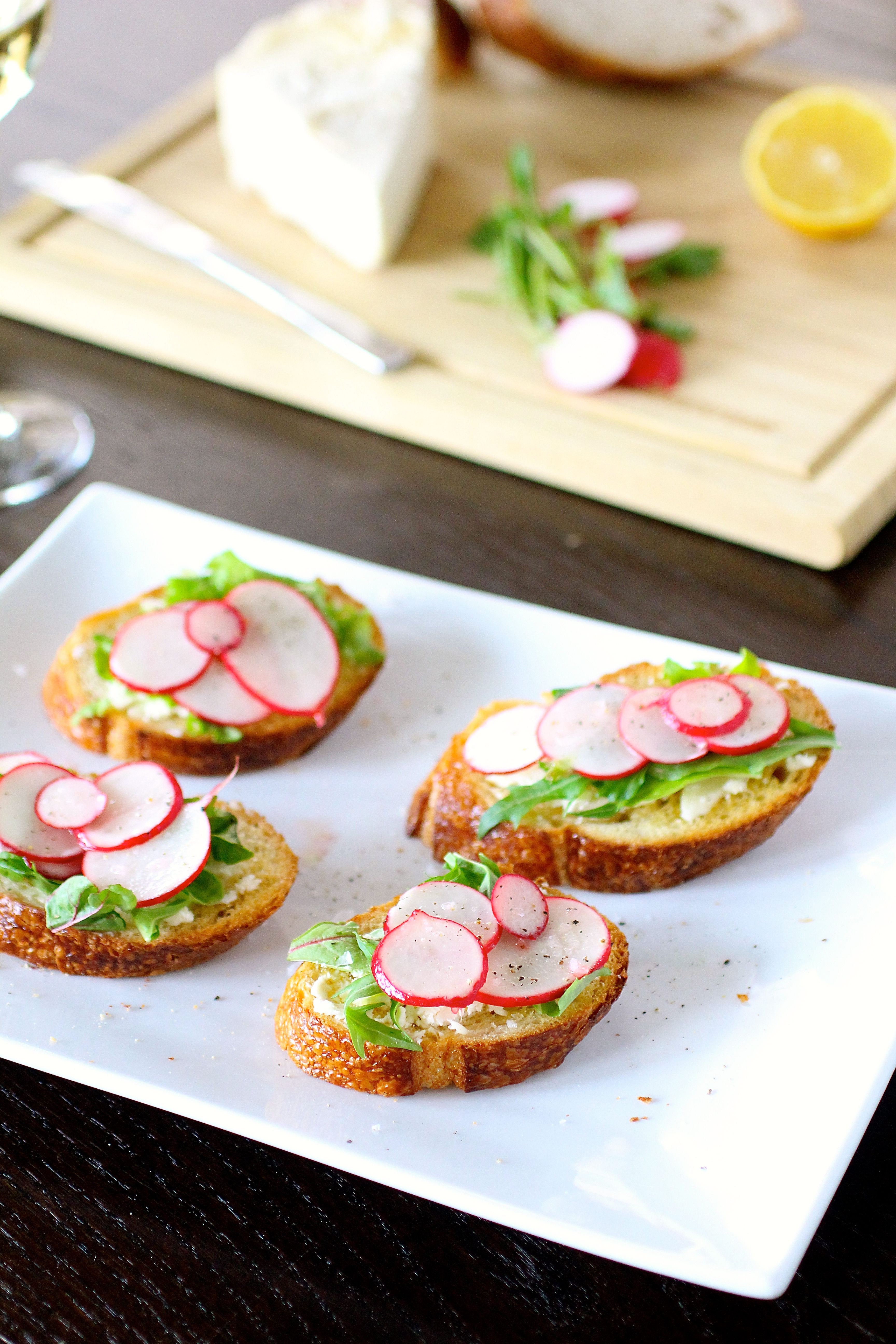 I’ve made some radish tea sandwiches before. Simple, elegant and completely “in season.” These, however, add a little oomph to the equation with some soft, creamy cheese and a little lemony vinaigrette. Made with some spring greens, these would be fantastic to serve up for a brunch/luncheon to celebrate warmer days and new beginnings. I served these toasted with some St. Andre cheese (substitute Brie or your favorite soft cheese here) and some chilled white wine. You can’t really go wrong here.